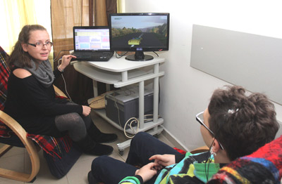 главата на пациента. Невротерапевтът стои пред втория монитор и